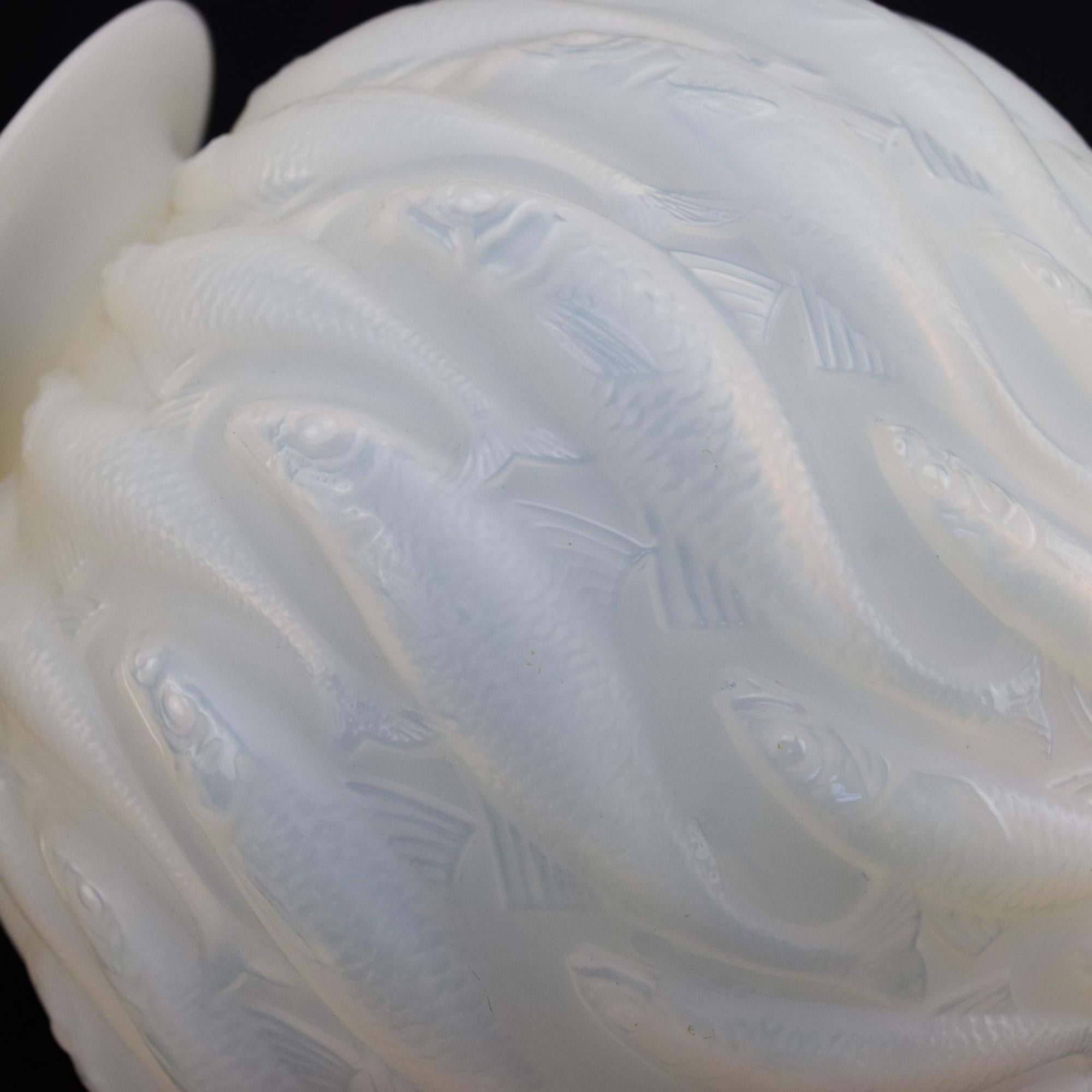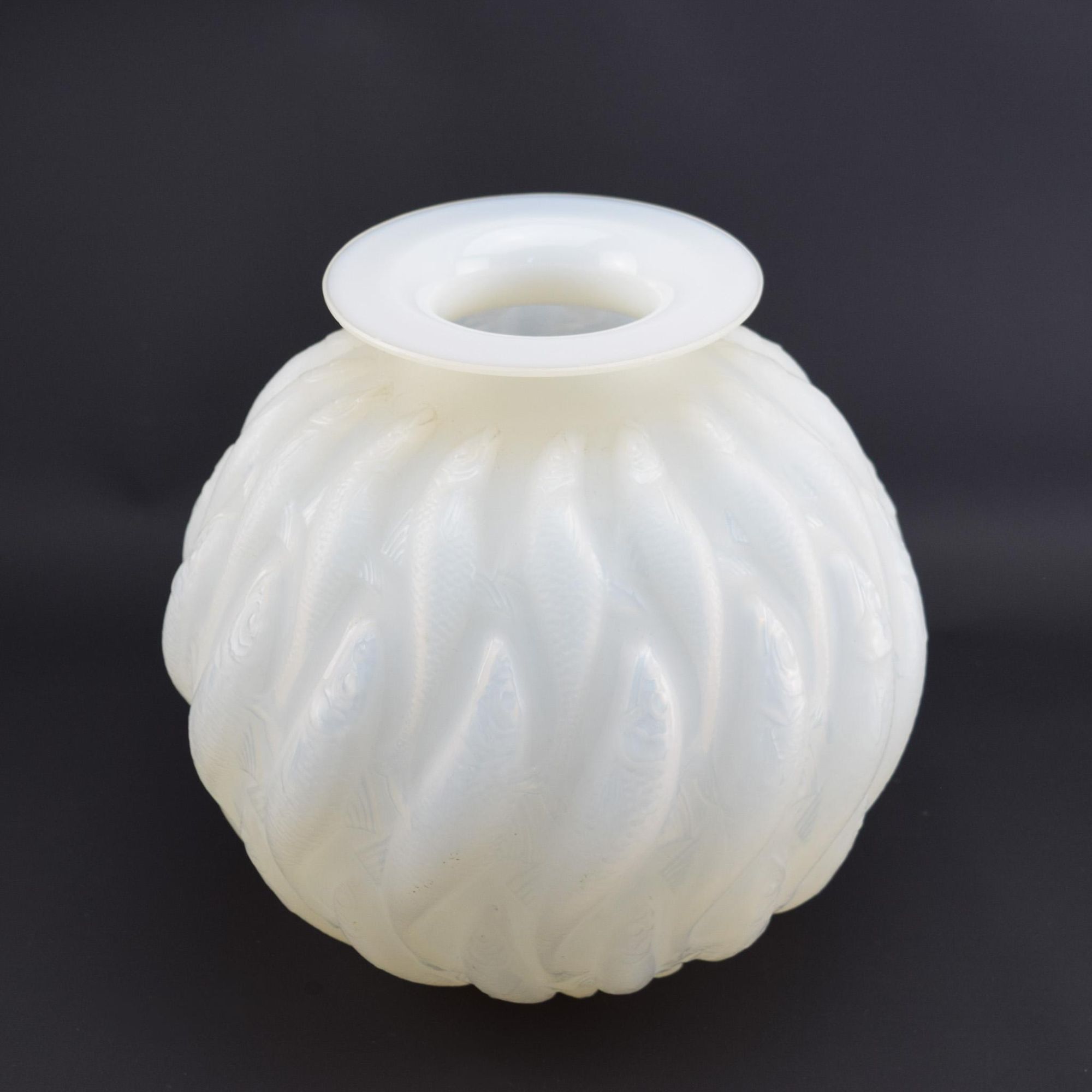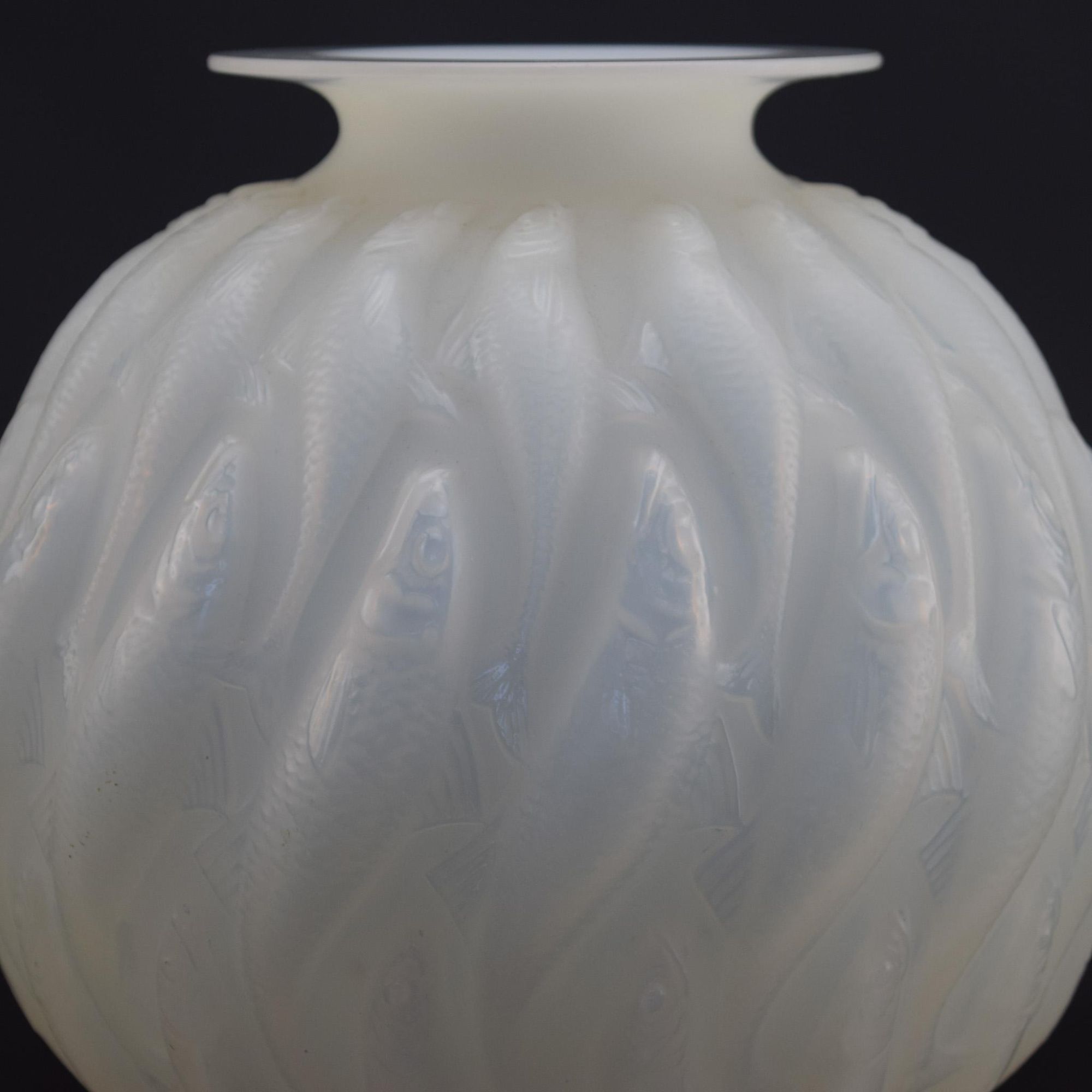 Rene Lalique cased deep opalescent Marisa vase moulded with continuous vertical fish.