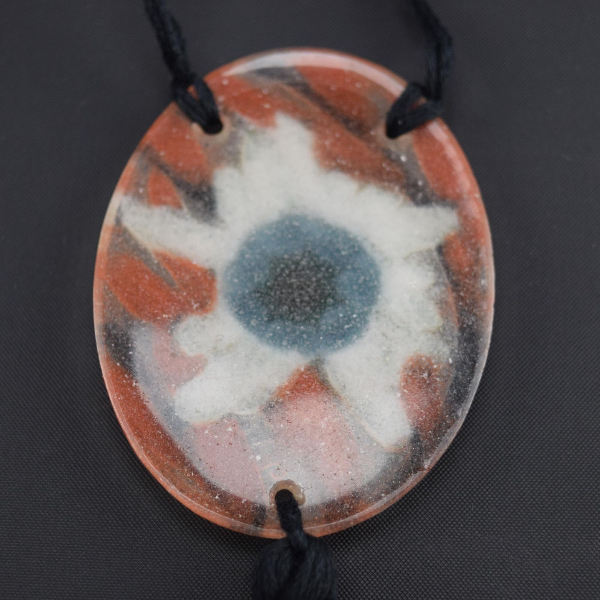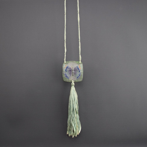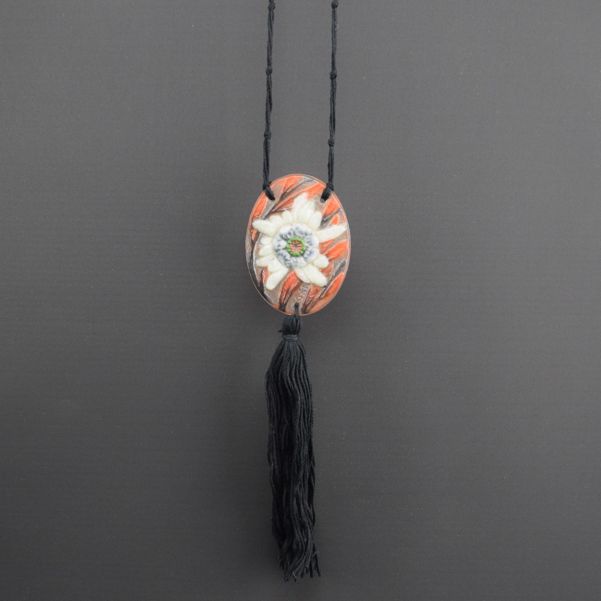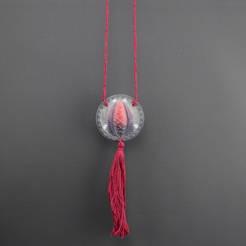 Strung with a black knotted cord and tassel
